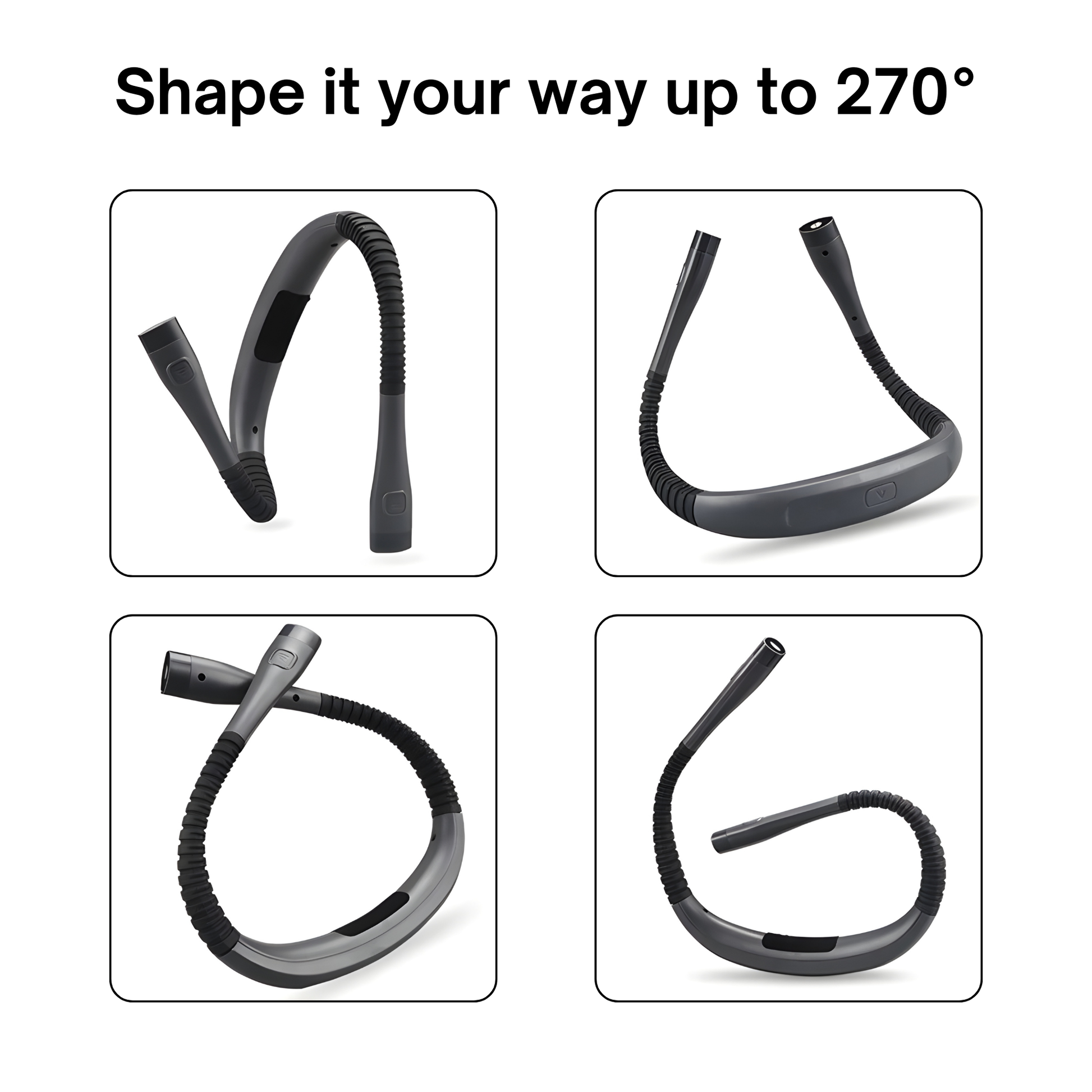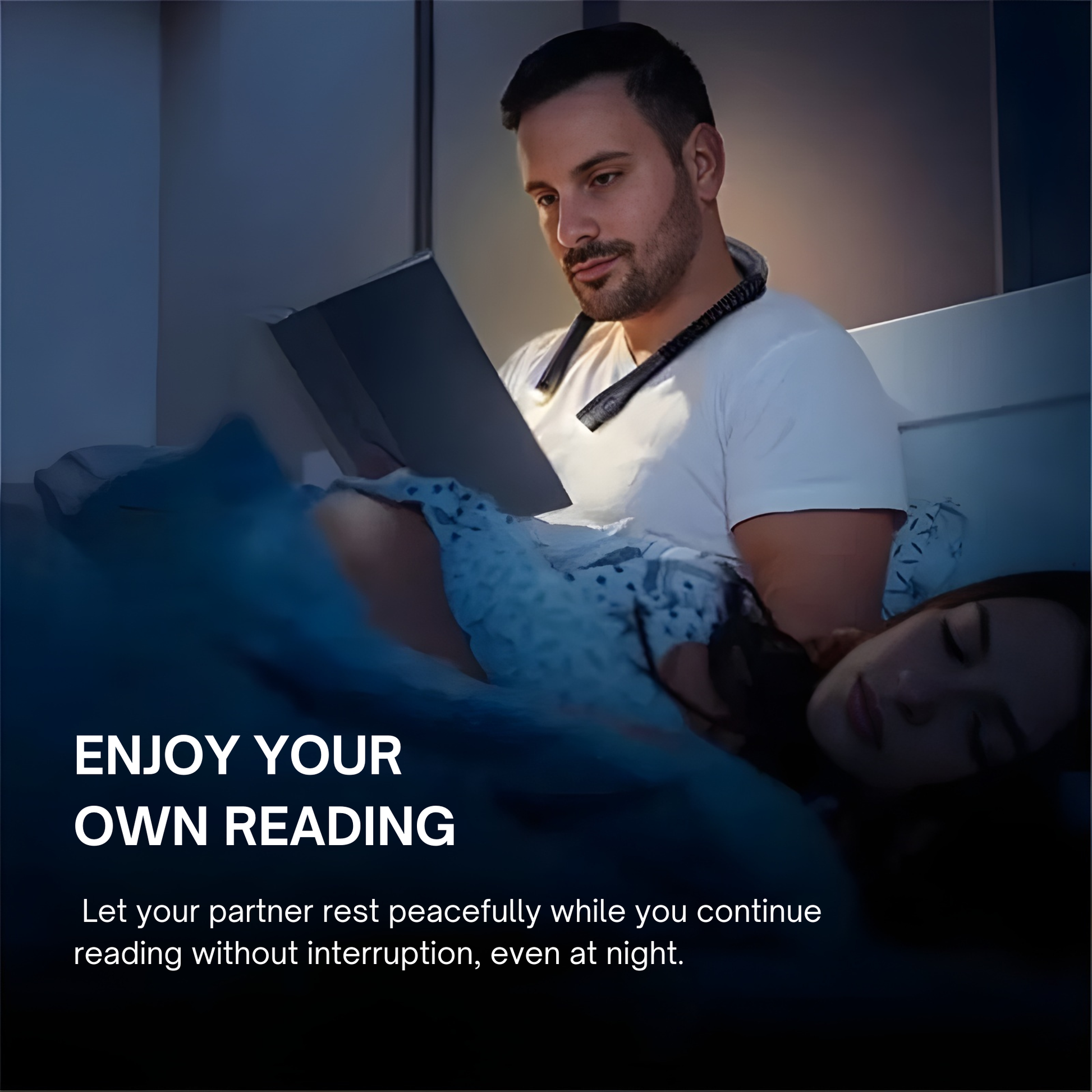 Hands-free neck reading lamp designed for maximum comfort, perfect for reading in bed, studying, knitting, traveling, or any task that requires focused lighting without disturbing others.