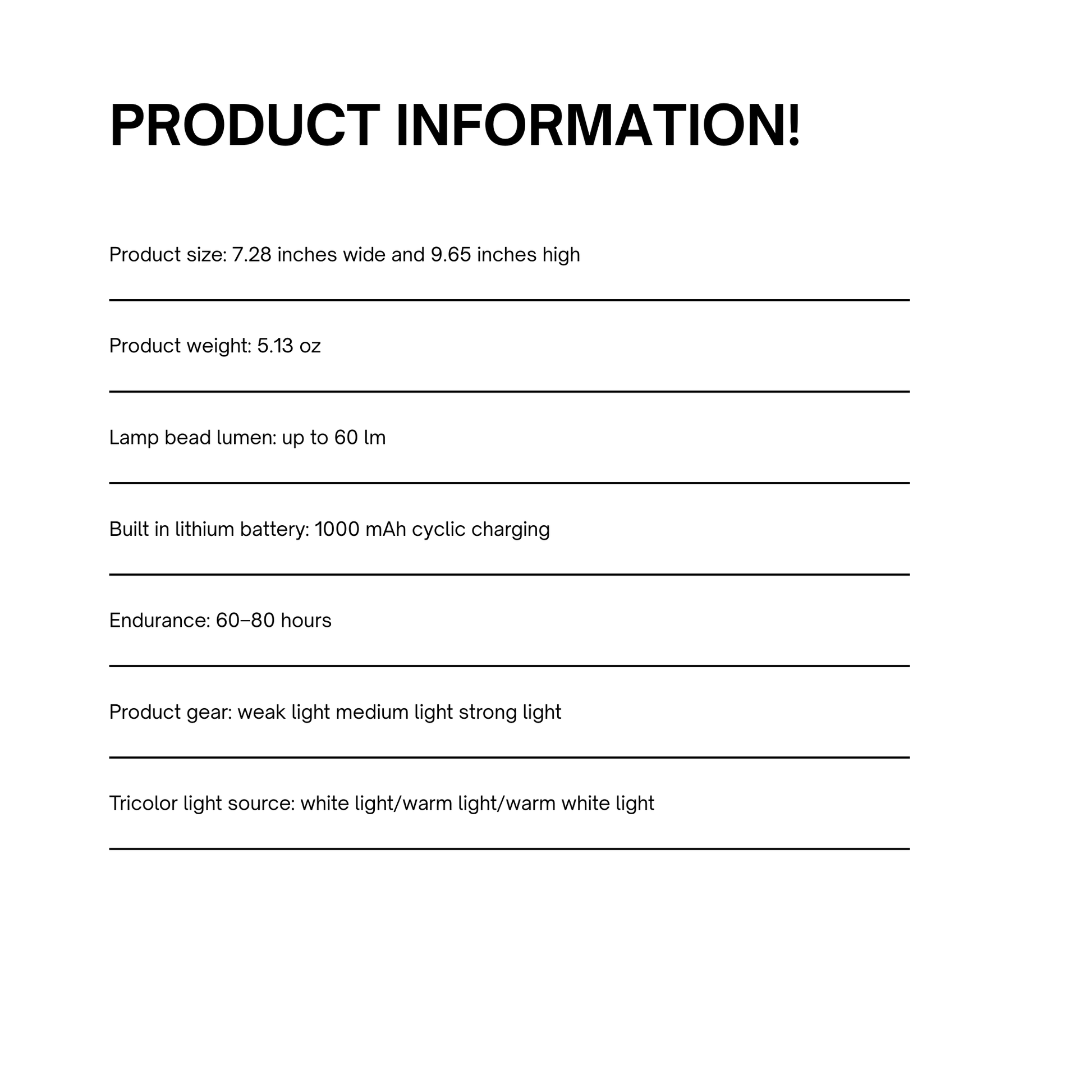 Features 3 light colors (white / warm white / warm yellow) and 3 brightness levels (low / medium / high), making it easy to adjust for different environments and times of day.